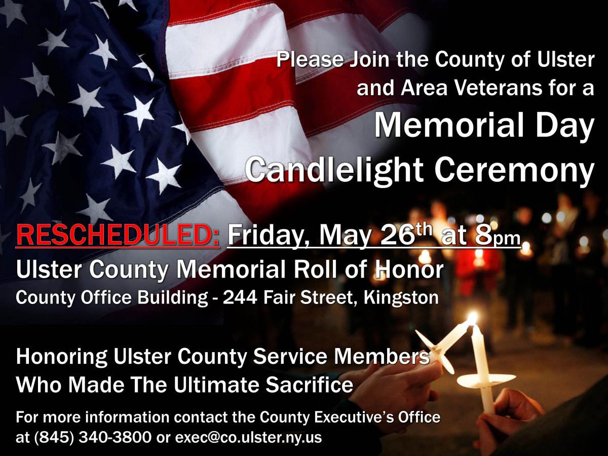 RESCHEDULED - Memorial Day Candlelight Ceremony Rescheduled to Friday, May 26th at 8pm Posted May 24, 2017 RESCHEDULED - Memorial Day Candlelight Ceremony Rescheduled to Friday, May 26th at 8pm Read more about RESCHEDULED - Memorial Day Candlelight Ceremony Rescheduled to Friday, May 26th at 8pm